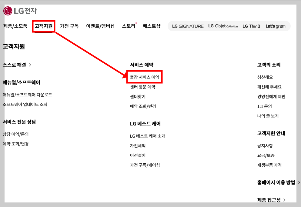☞ 상단 카테도리에서 [고객지원 > 서비스예약 > 출장 서비스 예약] 순으로 이동합니다.