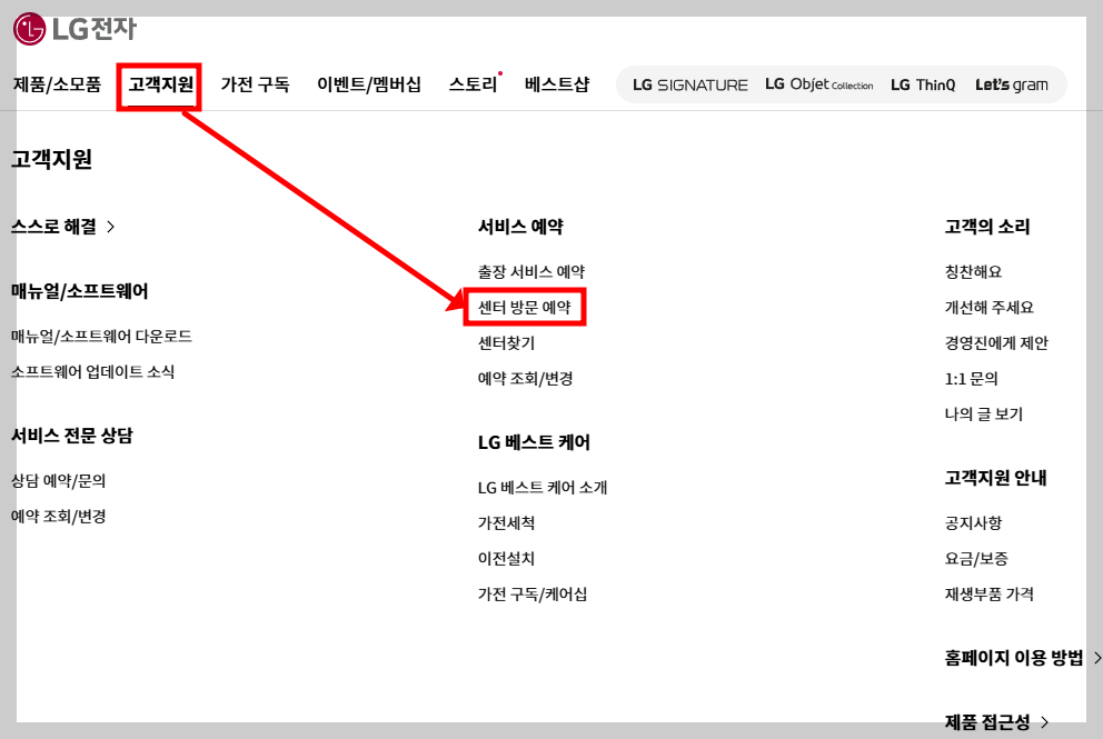 ☞ 상단 카테도리에서 [고객지원 > 서비스예약 > 센터방문 예약] 순으로 이동합니다.